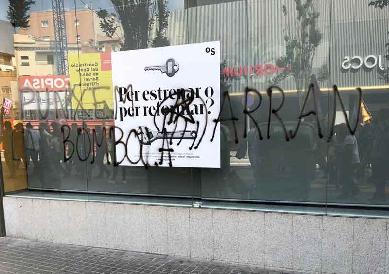 En el marco de la campaña “Pumxem la bombolla”, la organización ha pintado este miércoles, en el transcurso que diferentes grupos han realizado en Granollers, al menos los escaparates del Banc de Sabadell. Otras entidades han sido llenadas de carteles por colectivos como la PAH o Papers per Tothom. Integrantes de la organización han pintado en los escaparates el lema de la campaña y sus siglas.