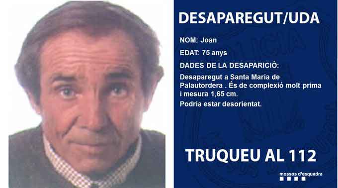 El desaparecido Joan Pujol Masnou, tiene 75 años y no se sabe nada de él desde hace dos meses. Los Mossos explican del desaparecido que físicamente es una persona muy delgada, mide 1,65 metros y podría estar desorientado.