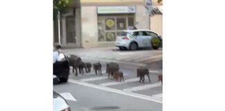 Un grupo de jabalíes atraviesa Granollers en medio del tráfico
