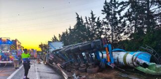 Un camionero es rescatado por los bomberos tras volcar en la AP-7 en La Roca...